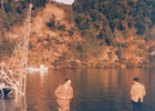 Grúa del puerto hundida en el agua, producto de los daños causados por el terremoto de 1960.
