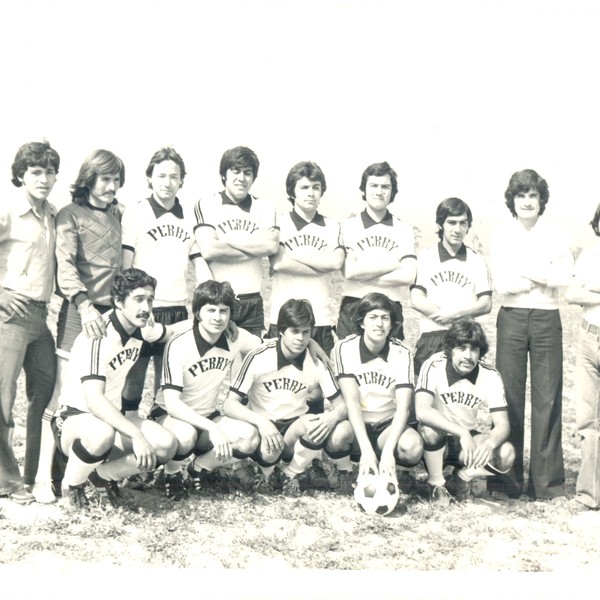 Equipo de fútbol Estrellas de Coquimbo UnidoDe izquierda a derecha: "El pirata", Jorge Rodriguez, Mario Espinoza, Belisario Silva, Juan Rodriguez, "Chapulin", Ibañez (arquero), Julio Dinamarca, "Liminhe", "Bine", "Torino", Julio Espinoza y el niño Felipe Campusano Perry.