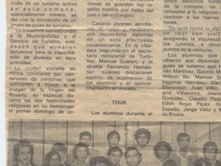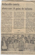 La nota refiere a la formación de guías de turismo en Andacollo, con el propósito de potenciar dicha actividad en esa zona minera. Entre los alumnos se encuentran: Hernán Martínez, Gastón Milla, Wilson Ife, Manuel Díaz, Ingemar Narváez, Marcos Marambio, Juan Véliz, Ingrid Villalobos, Jeanette González, Claudio Pastén, Edith Rojas Pérez, Rosa Zepeda, Jorge Véliz y Mario Rivera, junto al profesor Saúl Osorio, del Servicio de Turismo.