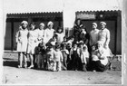 Paseo de los niños de la sala cuna "Rocío"Visitan a la casa de Elsa Saud (presidenta de Cema- Chile), ubicada en la esquina de las calles Chacabuco con Freire. En la fotografía aparecen: Maribel Alcayaga, Miriam Pérez, Juanita Ortiz, Elsa Saud, Elena Núñez Araya, Alejandra Bulnes, Miriam Valdivia y Carmen Rinerda.