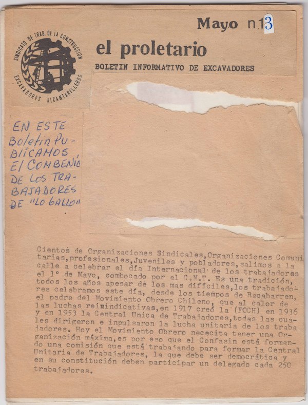 Boletín informativo editado por el Sindicato de Trabajadores de la Construcción, Excavadores y Alcantarilleros. En esta edición se publicó el Convenio de Trabajadores de Lo Gallo.