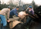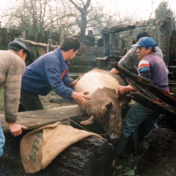 Faena de un cerdoBenigno Mora, Juana Fuentes y Rolando Fuentes Valenzuela, entre otros, sostienen al animal.