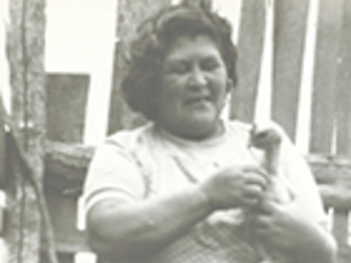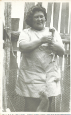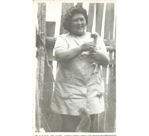 Elvira Viacache con una gallina en brazos en el patio de su casa.