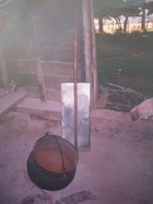 Olla de fierro donde se tiñen las lanas naturales, se aprecia el recipiente utilizado para tostar granos como el trigo y la linaza.