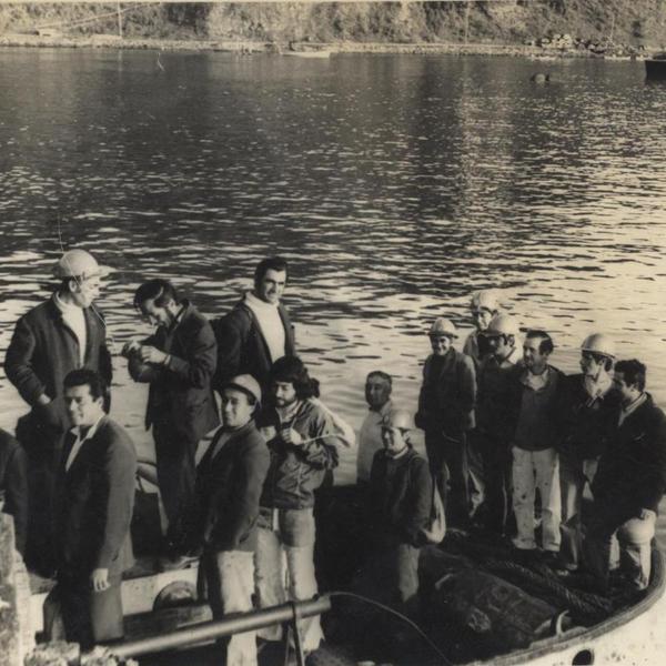 Remolcador lleva a los trabajadores desde el muelle de Corral hacia los barcos fondeados en la bahía. Aparecen Florentino Jaramillo, Silvio Maldonado, Bolívar Carvajal, Alberto Jaramillo, Armando Martínez, Pedro Vásquez, Patricio Pérez y Hernán Martínez.