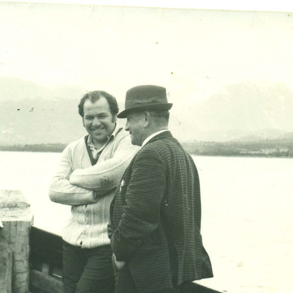 Viaje desde Ralún hasta Puerto Montt en la lancha San Antonio. La embarcación era propiedad de Nemoroso Villaroel, alias "don Nuno", quien en la imagen se encuentra junto a su amigo Jorge Schitman y su hijo del mismo nombre.
