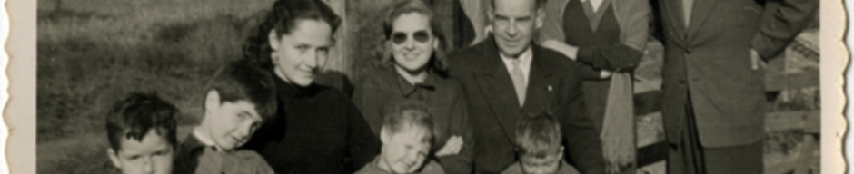 En el patio de la casa patronal de la familia Castellón. Se encuentran Juan Merino y su esposa, Pedro Castellón e Isabel Gazmuri, junto a los niños Patricio Castellón, Ricardo, Juan Hugo y Sonia Merino.