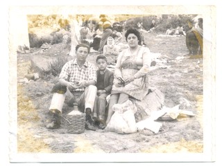 Pascual Peralta y Manuela Acuña junto a su hijo Miguel, esposo de Patricia Collado, donante de esta fotografía. La imagen fue capturada el 20 de septiembre de 1963 durante la celebración de fiestas patrias en La Pampilla. En aquellos años no habían carpas, los asistentes iban por el día y llevaban cocaví y la chuica de vino.
