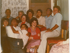 Visitan a la casa de Elsa Saud (presidenta de Cema- Chile), ubicada en la esquina de las calles Chacabuco con Freire. En la fotografía aparecen: Maribel Alcayaga, Miriam Pérez, Juanita Ortiz, Elsa Saud, Elena Núñez Araya, Alejandra Bulnes, Miriam Valdivia y Carmen Rinerda.